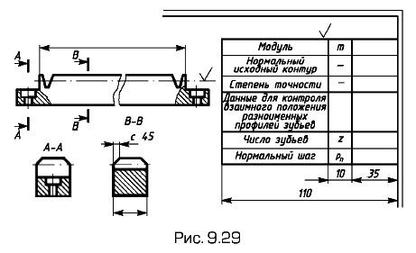 На поле чертежа в правом верхнем углу помещают таблицу параметров зубчатого венца, состоящую из трех частей, отделенных одна от другой сплошными основными линиями: первая часть — основные данные; вторая — данные для контроля; третья — справочные данные. В первой части таблицы указывают: модуль m стандартного ряда; число зубьев z (для зубчатого сектора — число зубьев секторного колеса); угол наклона β линии зуба косозубых и шевронных колес; направление линии косого зуба (надписью Правое или Левое, для шевронных колес — надписью Шевронное); нормальный исходный контур (стандартный — указанием соответствующего стандарта, нестандартный — указанием группы параметров, включающих угол профиля α, коэффициент высоты головки ha, коэффициент толщины зуба s и др.). Если исходный контур не полностью определен перечисленными параметрами, то на чертеже должно быть приведено его изображение с необходимыми размерами. В этой части таблицы приводят также коэффициент смещения х с соответствующим знаком и степень точности по нормам бокового зазора. Вторая часть таблицы содержит данные для контроля взаимного положения разноименных профилей зубьев. Перечень данных для зубчатых колес со стандартным или нестандартным исходным профилем определяется одним из контрольных комплексов, предусмотренных стандартом на допуски и нормы кинематической точности, плавности работы, контакта зубьев в передаче и бокового зазора. Вариант данных для прямозубых эвольвентных колес стандартного исходного контура включает: постоянную хорду зуба В третьей части таблицы указывают: делительный диаметр dd, шаг зацепления ра, осевой шагрх, ход зуба рz, обозначение чертежа сопряженного зубчатого колеса. При наличии двух (и более) венцов одного вида (см. рис. 9.28) значения параметров зубчатых венцов указывают в отдельных графах (колонках) таблицы с обозначением соответствующей колонки и венца прописной буквой русского алфавита. Если изделие имеет два (или более) венца разного вида (например, цилиндрический и конический), то для каждого венца заполняют отдельную таблицу. Таблицы допускается располагать рядом или одна под другой. Неиспользуемые строки таблицы параметров разрешено исключать или прочеркивать. Реечное зацеплениеПравила выполнения чертежей механически обработанных реек, сопрягаемых с эвольвентными цилиндрическими зубчатыми колесами, устанавливает ГОСТ 2.404—75. На изображении зубчатой рейки (рис. 9.29) указывают: длину нарезной части рейки; размеры фасок или радиусы скругления на кромках зубьев; шероховатость боковых поверхностей зубьев.