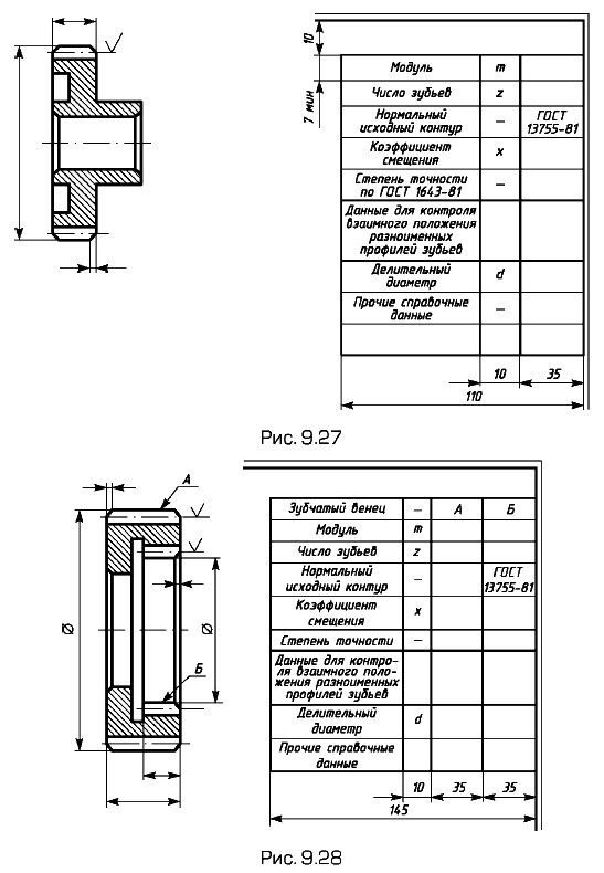Рабочие чертежи деталей. Детали со стандартными изображениями Стандартные изображения зубчатых передач и их деталей (продолжение)Изображение зубчатых передачПри изображении на чертеже зубчатых передач начальные и расчетные окружности, образующие начальных и расчетных окружностей, а также окружности больших оснований начальных конусов проводят тонкими штрихпунктирными линиями (см. рис. 9.23...9.26). Окружности и образующие поверхностей выступов зубьев и витков показывают сплошными основными линиями на всем протяжении, включая зону зацепления. На разрезе в зоне зацепления, если секущая плоскость проходит через оси зубчатых колес, принято зуб ведущего колеса показывать расположенным перед зубом ведомого колеса. Аналогично для червячных передач виток червяка показывают расположенным перед зубом червячного колеса. В реечном зацеплении зуб колеса изображают перед зубом рейки. Во всех случаях невидимые контуры допускается не наносить (см. рис. 9.24). Цилиндрические зубчатые колесаПравила выполнения чертежей эвольвентных зубчатых колес с указанием параметров зубчатого венца стандартизованы. На изображении (рис. 9.27, 9.28) указывают диаметр вершин зубьев, ширину венца, размеры фасок или радиусы притуплений на кромках зубьев, шероховатость боковых поверхностей зубьев.