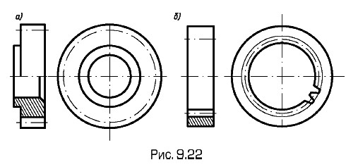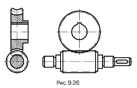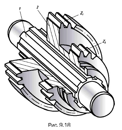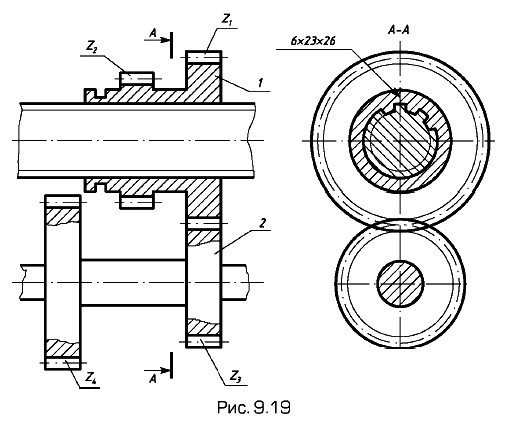 Пример изображения зубчатого соединения с двумя парами зубчатых колес с числами зубьев z1 и z3, z2 и z4 дан на рис. 9.19. Блок 1 зубчатых колес может перемещаться вдоль оси шлицевого вала и попеременно образовывать с зубчатыми колесами и валом две зубчатые передачи z1 и z3 или при перемещении блока влево — z2 и z4.