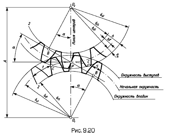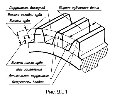 Преимущественное применение имеют прямозубые цилиндрические и конические передачи с эвольвентными зубьями. Геометрические и кинематические элементы зацепления цилиндрической пары колес с эвольвентными зубьями (см. рис. 9.20) имеют следующие определения. Делительная окружность — окружность, принадлежащая отдельно взятому колесу, на которой шаг t и угол зацепления колеса соответственно равны теоретическому шагу и углу зацепления режущего инструмента. Окружность выступов — окружность 1, проходящая через вершины зубьев. Окружность впадин — окружность 2, проходящая через основания зубьев. Полюс зацепления — точка Р на пересечении линии центров О1О2 с общей нормалью к сопряженным профилям в точке их касания (на линии зацепления). Начальная окружность — окружность, проходящая через полюс зацепления Р на линии центров колес. Начальные окружности двух находящихся в зацеплении колес касаются одна другой в полюсе зацепления и делят зубья колес по высоте на две части: головку и ножку. У отдельно взятого колеса начальной окружности не существует. Линия зацепления — линия, неподвижная относительно линии центров О1О2, по которой перемещается точка касания сопряженных элементов. Отрезок l' линии зацепления между начальной и конечной точками фактического касания сопряженных профилей называют активной частью линии зацепления. Шаг зацепления t — расстояние между одноименными точками двух смежных зубьев, измеренное по начальной окружности и равное отношению длины начальной окружности к числу зубьев: t = πd/z. Толщина зуба s —длина дуги окружности между двумя разноименными профилями одного зуба, измеренная по начальной окружности. Теоретическая толщина s = 0,5t используется для вычерчивания зубьев эвольвентного профиля. Модуль зацепления m — часть диаметра делительной окружности, приходящаяся на один зуб: m = t/π = d/z. Модуль является основной характеристикой размеров зубьев и измеряется в миллиметрах. Угол зацепления α — угол между линией центров и перпендикуляром к линии зацепления. Высота зуба или глубина впадины h — радиальное расстояние между окружностью выступов и окружностью впадин. Складывается из высоты головки зуба ha = m и высоты ножки зуба hƒ = 1,25m, т.е. h = 2,25m. Диаметр начальной окружности d = mz. Диаметр окружности выступов da = d + 2 ha = m(z + 2). Диаметр окружности впадин dƒ = d - 2hƒ = m(z - 2,5). Передаточное число зубчатой передачи i — отношение угловых ω скоростей ведущего и ведомого колес или отношение частоты вращения n ведущего и ведомого колес: i = ω1/ω2 = n1/n2. Межцентровое расстояние О1О2 = А = m(z1 + z2)/2. Стандартизовано два ряда модулей m (первый ряд считается предпочтительным), мм: 1- й ряд: 0,05; 0,06; 0,08; 0,1; 0,12; 0,15; 0,2; 0,25; 0,3; 0,4; 0,5; 0,6; 0,8; 1; 1,25; 2; 2,5; 3; 4; 5; 6; 8; 10; 12; 16; 20; 25; 32; 40; 50; 60; 80; 100; 2- й ряд: 0,055; 0,07; 0,09; 0,11; 0,14; 0,18; 0,22; 0,28; 0,35; 0,45; 0,55; 0,7; 0,9; 1,125; 1,375; 1,75; 2,25; 2,75; 3,5; 4,5; 5,5; 7; 9; 11; 14; 18; 22; 28; 36; 45; 55; 70; 90. При выполнении чертежей зубья и витки колес и червяков вычерчивают в осевых разрезах и сечениях, зубья реек — в поперечных. В остальных случаях зубья и витки не вычерчивают, ограничивая изображение окружностью по диаметру выступов. При необходимости профиль зуба или витка показывают на выносном элементе или ограниченном участке изображения детали. Условное изображение цилиндрических зубчатых колес с наружным (а) и внутренним (б) зубчатым венцом показано на рис. 9.22.