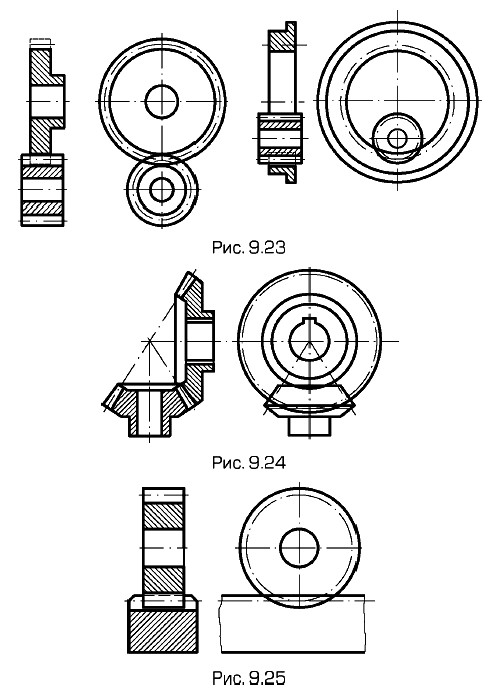 Окружности и образующие поверхностей впадин зубьев и витков на видах деталей допускается показывать сплошными тонкими линиями, а в разрезах и сечениях — сплошными основными линиями. В продольных осевых разрезах зубчатых колес, а также в поперечных разрезах реек и червяков зубья и витки условно совмещают с плоскостью чертежа и показывают нерассеченными независимо от профиля зуба и углов наклона зуба (углов подъема витка). Примеры применения стандартных условных изображений для зубчатых цилиндрических, конических и червячных колес приведены ниже.