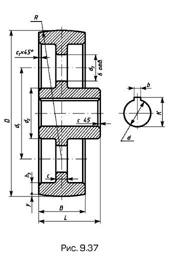Рабочую часть шкива выполняют: а) в виде торовой поверхности радиуса R или цилиндра (реже) и двух небольших конусов по краям обода для плоских ремней; б) с канавками для клиновых ремней; в) с зубьями для специального профиля обода для зубчатых ремней.