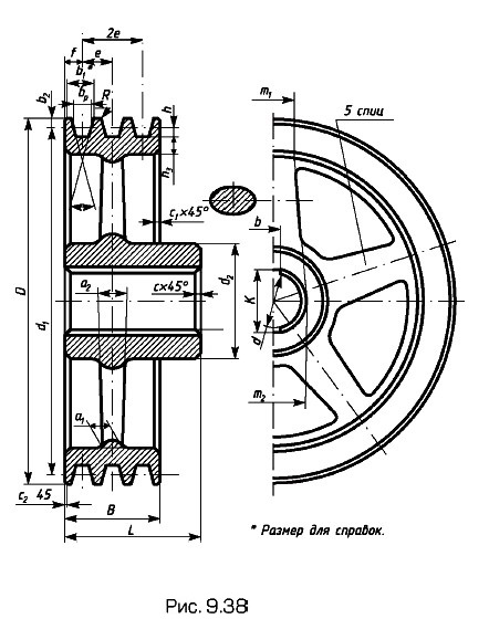 На чертеже шкива дают два изображения: фронтальный разрез плоскостью, проходящей через ось, и вид сборку. На разрезе спицы не штрихуют. На приведенных чертежах шкивов приведено рекомендуемое расположение размеров.