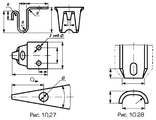 Размеры деталей, изготовленных гибкойПри гибке деталь приобретает форму, которая соответствует форме инструмента. Поэтому размеры следует ставить на внутренний контур детали (рис. 10.29) как для листового материала, так и для прутков. Радиус изгиба труб следует относить к оси трубы (чтобы труба не сплющивалась при загибке, ее предварительно набивают песком).