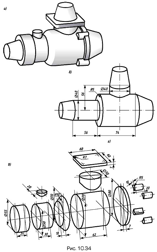 Размеры детали, изготавливаемой литьемПример учета особенностей конструкции литой детали при нанесении размеров приведен на рис. 10.33. На рис. 10.32 дано наглядное изображение детали, на рис. 10.34, а изображена литейная модель детали (конические выступы соответствуют таким же выступам на стержне), на рис. 10.34, в — элементарных тел, образующих форму литейной модели, на рис. 10.34, б — литейный стержень (для формообразования внутренней полости).