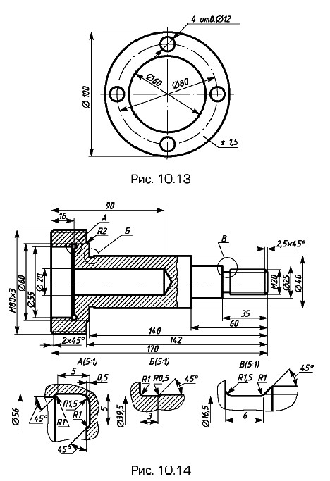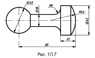 При нанесении нескольких (параллельных) размерных линий следует избегать взаимного пересечения выносных и размерных линий (пересечение выносных линий допускается). Расстояние между размерными линиями и параллельной им линии контура должно быть 7—10 мм. Перед размерным числом диаметра во всех случаях следует наносить знак диаметра ∅, а перед размерным числом радиуса — букву R (рис. 10.7).