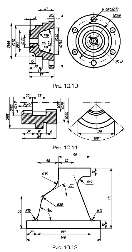 Для деталей тел вращения или сочетания различных тел вращения размеры диаметров следует проставлять на изображении, полученном проецированием на плоскость, параллельную оси тела. При такой простановке размеров можно легко прочитать форму детали (рис. 10.10). Нанесение размеров диаметров окружностей на изображении, полученном проецированием на плоскость, перпендикулярную оси тела, допускается для максимального и минимального диаметров и для диаметра окружности, характеризующей расположение осей отверстий. Для деталей, представляющих собой часть тела вращения, полученных разрезкой заготовки на две или несколько частей, размеры проставляют также на изображении, полученном проецированием на плоскость, параллельную оси, а размерные линии выполняют с обрывом (рис. 10.11). Угловые размеры осей отверстий ∅ 10 (рис. 10.10), равномерно расположенных по окружности, обычно не проставляют, а указывают только их количество. При простановке размеров на деталях сложной конфигурации с плавными переходами фиксируют основной контур, составленный из прямолинейных участков, как показано на рис. 10.12.