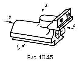 На основании личного опыта, консультации преподавателя определяют назначение детали, ее материал и последовательность изготовления. При съемке эскизов деталей не допускается «упрощать» форму их элементов. Выбор изображений, главного изображения, формата и планировки подробно рассмотрен в гл. 9. При этом руководствуются правилами выполнения изображений предметов, изложенными в гл. 5. В качестве примера рассмотрим деталь — подвижную губку ручных слесарных тисков, приведенную на рис. 10.45. Деталь имеет плоскость симметрии. Технология изготовления: отливка, фрезеровка направляющих типа «ласточкин хвост», плоскостей наковаленки и под планку губы, шлифовка направляющих и плоскости наковаленки, расточка центрального отверстия, слесарная обработка двух резьбовых гнезд.