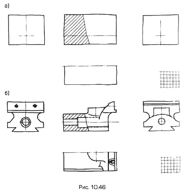 Для полного выявления формы детали необходимы четыре вида по стрелкам 1, 2, 3 и 4, а также разрез с секущей плоскостью, совпадающей с плоскостью симметрии. В качестве главного изображения удобно взять часть вида по стрелке 1, соединенного с частью фронтального разреза. В этом случае на видах слева по стрелке 2, справа по стрелке 4 и сверху по стрелке 3 выявляют форму всех элементов детали. Учитывая симметрию, можно ограничиться половиной вида сверху. Последовательность выполнения эскиза1. Нанесение линий внутренней рамки и основной надписи. В соответствующих графах студент сразу должен вписать свою фамилию и номер группы. 2. Выполнение планировки, т.е. вычерчивание прямоугольников по габаритным размерам изображений, и нанесение осевых и центровых линий (рис. 10.46, б), предусматривая место для размеров, согласование планировки с преподавателем. 3. Вписывание контуров изображений в эти прямоугольники, выполнение разрезов (рис. 10.46, в): фронтального, местного. Эту работу выполняют в модельной аудитории, имея перед глазами деталь. 4. Нанесение выносных и размерных линий (рис. 10.46, в, г). Эту работу целесообразно выполнять дома. 5. Измерение детали и нанесение размерных чисел (рис. 10.46, е). К измерению приступают, только убедившись в правильности нанесения размерных линий. 6. Обводка эскиза. Толщина обводки s = 0,8...1 мм.
