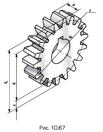 Определение некоторых параметров зубчатого венца цилиндрического зубчатого колеса. При выполнении эскиза зубчатого колеса с натуры (рис. 10.67) снимают диаметр de выступов, ширину b, подсчитывают число зубьев Z.