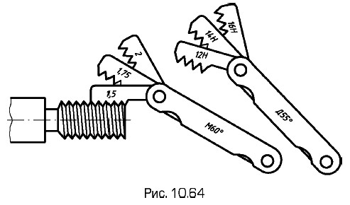 Определение параметров стандартных резьб производят с помощью штангенциркуля и резьбомеров. Резьбомеры (рис. 10.64) представляют собой набор шаблонов (тонких стальных пластинок), измерительная часть которых соответствует профилю стандартной резьбы. Изготавливают резьбомеры двух типов: для метрической резьбы с клеймом М 60° и размером шага в миллиметрах на каждой пластине и для дюймовой и трубной резьб с клеймом Д 55° и указанием числа ниток на дюйм на каждой пластине.