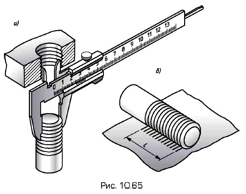 Для измерения шага резьбы на детали резьбомером подбирают шаблон-пластинку, зубцы которой совпадают со впадинами измеряемой резьбы (см. рис. 10.64). Затем читают указанный на пластинке шаг (или число ниток на дюйм). Наружный диаметр стержня (или внутренний диаметр в отверстии) измеряют обычным путем штангенциркулем (рис. 10.65, а).