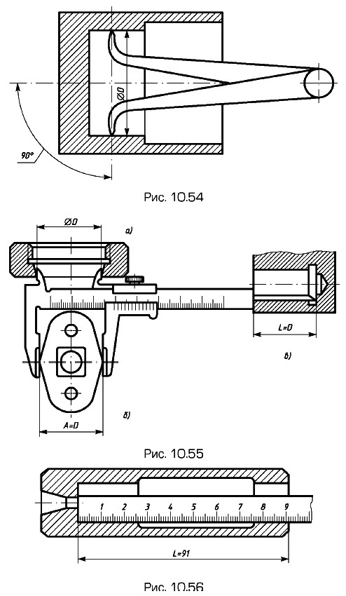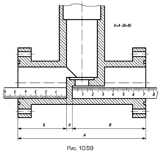 Примеры измерения толщины внутренних стенок: на рис. 10.59 — измерительной линейкой, на рис. 10.60 — кронциркулем с линейкой. В первом случае толщину стенки определяют по результатам измерения трех размеров — А, Б, В. Во втором случае — по результатам двух измерений: а) размера А — при измерении на детали; б) размера Б — по линейке. Размер Б выбирают таким, чтобы кронциркуль, не раздвигая измерительных ножек, можно было отвести от детали.