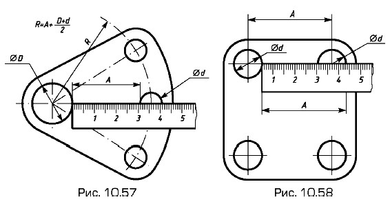 Чертежи оригинальных деталей Определение размеров деталей с натурыДля определения линейных размеров при выполнении эскизов используют простейшие измерительные инструменты — измерительную линейку, кронциркуль (для измерения наружных размеров), нутромер (для внутренних размеров). С их помощью размеры измеряют с погрешностью 1...0,5 мм. Более точно (с погрешностью 0,1...0,05 мм) измеряют размеры штангенциркулем. Примеры измерения диаметров указанными инструментами: на рис. 10.54 — нутромером, на рис. 10.55, а — штангенциркулем; длин L: на рис. 10.55, в — штангенциркулем, на рис. 10.56 — линейкой; размера А на рис. 10.55, б — штангенциркулем. Схемы измерения расстояний между осями отверстий показаны на рис. 10.57 и 10.58.
