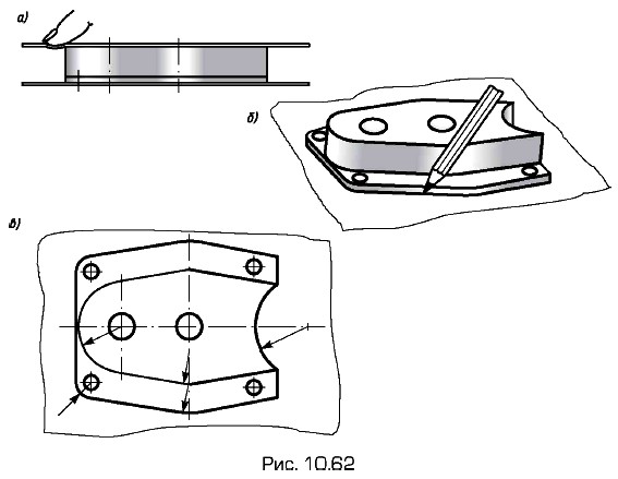 Углы измеряются с точностью до 10° угломером (рис. 10.61). В данном случае в наклонное отверстие введен гладкий стержень. Съемка размеров контура с помощью отпечаткаПри острых краях форму и размеры плоского контура можно снять в виде отпечатка на бумагу. Бумагу накладывают на плоскость детали и пальцем прижимают к кромкам (рис. 10.62, а). Можно деталь положить на бумагу и контур обвести острым карандашом (рис. 10.62, б). По отпечатку устанавливают геометрическую форму и размеры контура (рис. 10.62, в). Радиусы и центры дуг определяют, проведя перпендикуляры из середины двух хорд дуги одного радиуса, при наличии оси симметрии ее можно считать за один из перпендикуляров.
