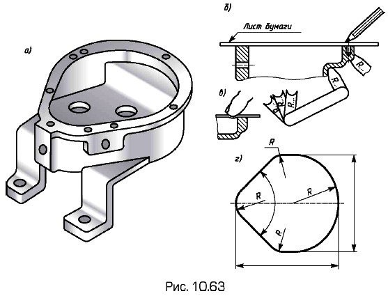 Отпечаток контура кромки внутренней полости детали (рис. 10.63, а) снимают на бумагу протиранием контура графитом карандаша (б) или нажатием пальца (в). По отпечатку устанавливают геометрическую форму и размеры контура (г). Радиусы закруглений галтелей определяют (рис. 10.63, б) радиусомером (набор шаблонов).