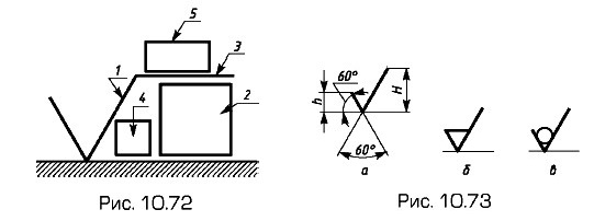 где Hmax i. — высота i-го наибольшего выступа профиля; Hmin i. — глубина i-й наибольшей впадины профиля. Числовые значения параметров шероховатости Ra, Rz и др. приведены в ГОСТ 2789—73. Обозначение шероховатости поверхностей (ГОСТ 2.309—73)Шероховатость поверхностей обозначают на чертеже для всех выполняемых по данному чертежу поверхностей детали независимо от методов их образования, кроме поверхностей, шероховатость которых не обусловлена требованиями конструкции. В обозначении шероховатости поверхности, вид обработки которой конструктор не устанавливает, применяют знак, указанный на рис. 10.72. Структура обозначения шероховатости поверхности: 1 — знак; 2 — базовая длина; параметр (параметры) шероховатости; 3 — полка знака; 4 — условное обозначение направления неровностей; 5 — способ обработки и (или) другие дополнительные указания. На рис. 10.73 приведены варианты знаков в обозначении шероховатости поверхности: а — способ обработки поверхности конструктор не устанавливает; б — удаляется слой материала; в — поверхность образуется без удаления слоя материала с указанием значения параметра шероховатости.