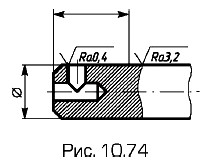 В обозначении применяют один из знаков шероховатости, изображенных на рис. 10.73. Высота h приблизительно равна примененной на данном чертеже высоте цифр размерных чисел. Высоту Н принимают равной (1,5...3)h. Толщина линий знаков примерно равна половине толщины сплошной основной линии чертежа. В обозначении шероховатости поверхности, образуемой без снятия слоя материала, например литьем, ковкой, объемной штамповкой, прокатом, волочением и т.п., применяют знак Vх; поверхности, не обрабатываемые по данному чертежу, обозначают этим же знаком. Состояние поверхности, обозначаемой знаком '9/, должно удовлетворять требованиям, установленным соответствующим стандартом или техническими условиями на сортамент материала. Значение параметра шероховатости Ra указывают в ее обозначении без символа, например 0,32; для остальных параметров — после соответствующего символа, например Rz16. Здесь указано наибольшее допустимое значение параметров шероховатости; их наименьшее значение не ограничивается. Обозначение шероховатости поверхности на изображении детали располагают на линиях контура (рис. 10.74), выносных линиях (по возможности ближе к размерной линии) или полках линий- выносок.