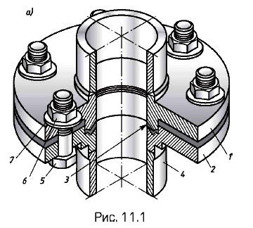 Изображение соединений деталей Общие сведения о изображении соединений деталейСоединения деталей между собой в приборах, машинах, установках весьма разнообразны по своему назначению, конструктивной форме, технологии изготовления. Примеры применения некоторых из них приведены на рис. 11.1. В конструкции (рис. 11.1, а) разъемного фланцевого соединения вакуумного трубопровода применены три вида соединений: разъемное (вакуумное и болтовое) и неразъемное (сварное). Соединение фланцев 1 и 2, образует кольцевой зуб на фланце 1 и ответную канавку на фланце 2, в которую зуб вдавливает металлическую кольцевую прокладку 3 из пластичного ленточного материала, например меди. Формы сечений зуба и канавки установлены экспериментально. Сжатие фланцев вдоль оси обеспечивает болтовое соединение (в данном случае четырьмя болтами), состоящее из болта 5, шайбы 7и гайки 6. Патрубки 4 приварены к цилиндрическим выступам фланцев плавящимся электродом (на изображении их соединения условно показаны форма кромок до сварки и наплавленный металл — сварной шов).