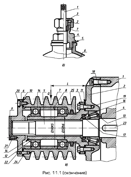 В конструкции (рис. 11.1, в) консольного шкива клиноременной передачи применены болтовые, винтовые, штифтовое, шпоночное и шлицевое между валом 5 и фланцем 6 разъемные соединения, опоры на шариковых и роликовых подшипниках качения, герметичное кольцевое 25 и манжетное 17 уплотнения, уплотнения с помощью прокладок 10 и 11. В данной конструкции на неподвижном корпусе 1 болтами 18 закреплена крышка 2, на ней болтами 19 через прокладку 11 закреплен кронштейн (цапфа) 3, являющийся опорой для подшипников 14 шкива 7. На шкиве 7 винтами 20 закреплен фланец 6 (имеющий внутренние шлицы, см. рис. 9.48). Вал 5 вращается в корпусе 1 на роликовых подшипниках качения. Вращение от шкива 7 через фланец 6, вал 5 и шпонку 23 передается детали 4. Втулка 8 служит для установки шарикоподшипников. Их положение на валу фиксирует кольцо 12 и пружинное кольцо 14. Кольцо 13 устанавливает расстояние между деталью 4 и торцом внутреннего кольца роликового подшипника. Штифт 24 фиксирует положение крышки на шкиве, винт 22 предотвращает его выпадение. Крышка 9, закрепленная винтами 21, герметизирует полость подшипников. В данной конструкции радиальное усилие на шкиве 7 от натяжения ремней воспринимает кронштейн 3, т.е. изгибающий момент не передается на вал 5. Изображения соединений стандартными деталями рассмотрены ранее по ходу изложения курса: болтовое — рис. 8.21, 8.27, винтовое — рис. 8.30, шпилечное — рис. 8.32, трубное — рис. 8.34, шпоночное и шлицевое — рис. 9.18 и 9.19, схема зубчатого соединения — рис. 9.20, зубчатое цилиндрическое соединение с внутренним и наружным зацеплением — рис. 9.23, коническое — рис. 9.24, реечное — рис. 9.25, червяная передача — рис. 9.26. Поэтому ниже рассмотрены некоторые особенности разъемных соединений и неразъемные соединения.