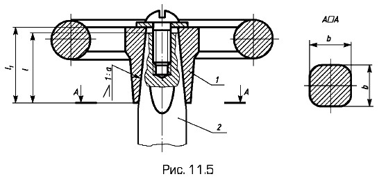 Сопряженные размеры двух пирамидальных поверхностей показаны на рис. 11.5. Для передачи крутящего момента c маховика 1 на шток 2 вакуумного вентиля их сопряжение выполнено в виде четырехгранной пирамиды. Сопряженные размеры здесь — уклон
