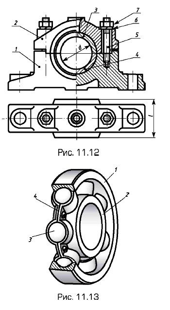 Изображение соединений деталей Изображение подшипниковПодшипники (или опоры) служат для поддержания шеек вращающихся валов или осей различных передач. Различают подшипники скольжения и подшипники качения. Типовой подшипник скольжения состоит из корпуса, вкладышей и смазывающих устройств (рис. 11.12). Подшипники качения — это стандартные узлы, состоящие из внутреннего 2 и наружного 1 колец, между которыми располагаются тела качения 3 — шарики или ролики. Тела качения удерживаются на определенном расстоянии друг от друга специальной обоймой 4 — сепаратором (рис. 11.13). Стандартные подшипники скольжения (см. рис. 11.12) состоят из корпуса 1, крышки 2, вкладышей 3 и 4, шпилек 5, шайб 6 и гаек 7. Нестандартные подшипники скольжения могут состоять только из двух вкладышей, размещаемых в опорах корпуса, например двигателя автомобиля. Подшипники скольжения требуют специальную систему смазки.