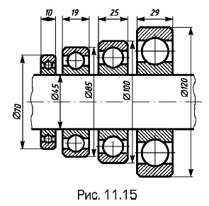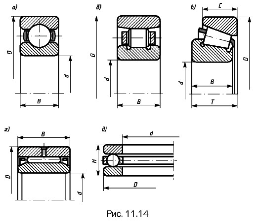 На рис. 11.15 показаны однорядные радиальные шариковые подшипники для вала d = 45 мм различных серий по наружному диаметру (слева направо) — особо легкой серии, легкой, средней и тяжелой — и узких по ширине, выпускаемых по ГОСТ 8338—75.