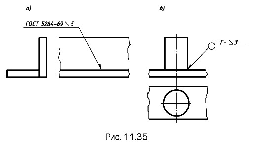 Упрощение обозначений швов сварных соединенийПри наличии на чертеже швов, выполняемых по одному и тому же стандарту, стандарт приводят в технических требованиях по типу Сварные швы... по... или в таблице. Если все швы одинаковы и изображены с одной стороны, то порядковый номер им не присваивают, а швы отмечают линиями-выносками без полок (рис. 11.34), обозначение шва указывают в технических требованиях.