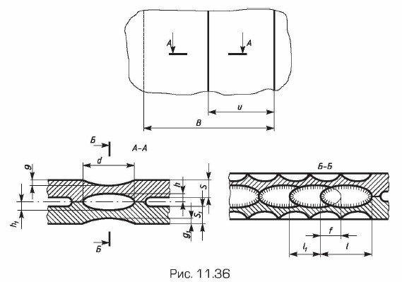 Пример конструктивных элементов соединений контактной шовной сваркой приведен на рис. 11.36. На нем указаны: d — расчетный диаметр литого ядра точки или ширина литой зоны шва; h и h1 — величина проплавления; ƒ — перекрытие литых зон шва; В — ширина нахлестки; расстояние u ≥ 0,5B; s и s1 — толщины свариваемых деталей; g и g1 — глубина вмятия не более 1/5 толщины деталей; l ≈ d.