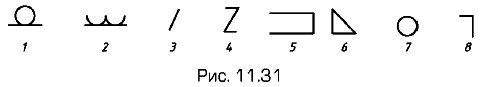 Вспомогательные знаки в условных обозначениях сварных соединений (рис. 11.31): 1 — усиление шва снять; 2 — наплывы и неровности шва обработать с плавным переходом к основному металлу; 3 — шов прерывистый или точечный с цепным расположением, угол наклона линии 60°; 4 — шов прерывистый или точечный с шахматным расположением; 5 — шов по незамкнутой линии (знак применяют, если расположение шва ясно из чертежа); 6 — знак в прямоугольнике 4 (см. рис. 11.30) перед размером катета по стандарту; 7 — шов по замкнутой линии (диаметр знака 3...5 мм); 8 — шов выполнить при монтаже изделия, т.е. при установке его по монтажному чертежу на месте применения. На месте прямоугольника 5 записывают следующие данные: