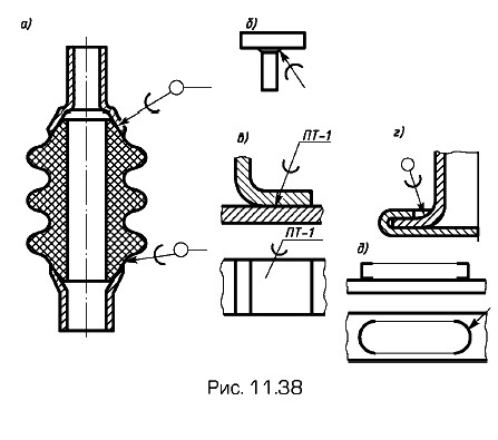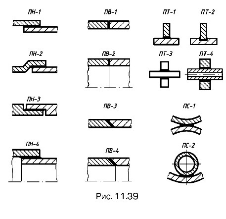 При необходимости на изображении паяного соединения указывают размеры шва и обозначения качества его поверхности. Конструкции паяных соединений весьма разнообразны. На рис. 11.38 даны примеры паяного соединения керамического изолятора (а) с металлическими деталями, таврового паяного соединения двух пластин (б, в), трубы по замкнутому контуру (г), ограниченного определенными участками (д). Основные типы паяных соединений (рис. 11.39): ПН-1 — ПН-3 — нахлесточные; ПН-4 - ПН-6 — телескопические; ПВ-1, ПВ-2 — стыковые; ПВ-3, ПВ-4 остыковые; ПТ-1 — ПТ-4 — тавровые; ПУ-1, ПУ-3 — угловые; ПС-1, ПС-5 — соприкасающиеся. Кроме указанных в промышленности широко применяются комбинированные соединения.