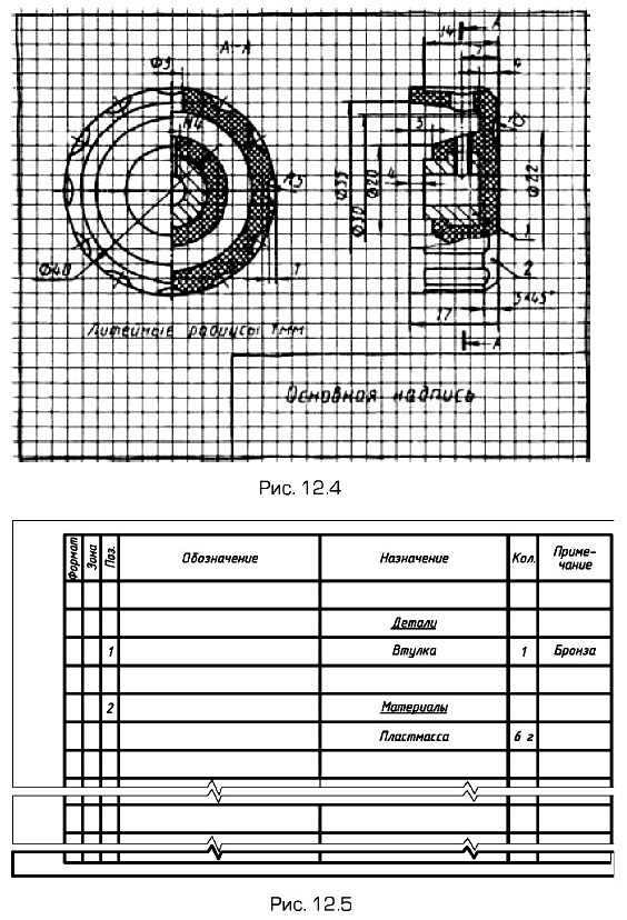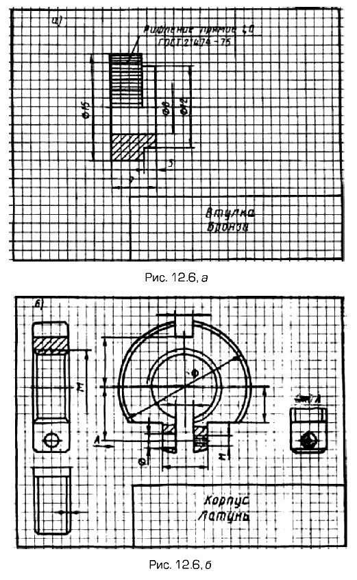 Чертеж общего вида изделия Выполнение эскизов для чертежа общего видаОбщие правила съемки эскизов деталей рассмотрены в гл. 10. При съемке эскизов деталей для выполнения чертежа общего вида сборочной единицы особое внимание обращают на вопросы нанесения и увязки размеров смежных, сопрягаемых деталей. В гл. 10 рассмотрена система нанесения размеров главным образом из технологических соображений (см. § 10.5), от технологических баз. При съемке же эскизов деталей сборочных единиц некоторые размеры наносят с учетом взаимосвязи этих деталей в устройствах и их конструктивных особенностей, т.е. из конструктивных соображений, от конструкторских баз. Эти особенности рассмотрены ниже. При съемке эскизов для чертежей общего вида иногда выполняют эскизы сборочных единиц, входящих в состав устройства. К числу таких сборочных единиц относятся армированные изделия, например из пластмассы с металлическими деталями. В качестве примера на рис. 12.4, 12.5, 12.6, а — и приведен комплект выполненных эскизов для верньера (рис. 12.6, б — и только с размерными линиями), чертеж общего вида которого приведен на рис. 12.2.