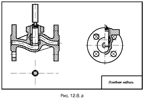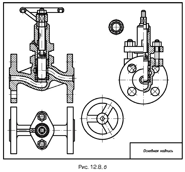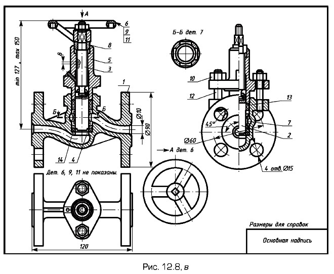 Размер шрифта номеров позиций должен быть на один-два размера больше, чем размер шрифта, принятого для размерных чисел на том же чертеже (на чертежах общего вида в учебном процессе номера позиций выполняют шрифтом № 7). Выполнение таблицы составных частей изделияДля чертежа общего вида перечень составных частей изделия оформляют в виде таблицы (ГОСТ 2.120-73). Таблицу составных частей изделия по содержанию, а также порядок ее заполнения обычно принимают аналогичными спецификации и порядку ее заполнения, которые предусмотрены для уборочных чертежей (см. § 13.1). Таблицу выполняют на одном листе с чертежом общего вида и размещают на свободном поле чертежа, обычно в правом нижнем углу чертежа непосредственно над его основной надписью. Чертеж общего вида более сложного изделияПоэтапное выполнение чертежа общего вида более сложного изделия — вентиля приведено на рис. 12.8, а, б, в.