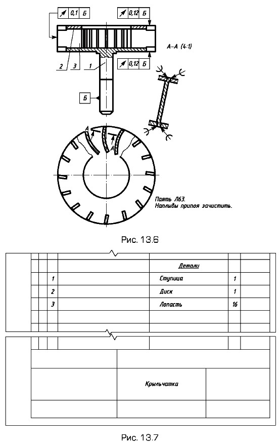 Из сравнения чертежей общего вида (см. рис. 13.2) и сборочного (рис. 13.4) видно их существенное различие. На сборочном чертеже: меньшее число изображений (два) вентилятора; вместо горизонтального разреза А — А выполнен профильный разрез А — А, что позволило сделать чертеж более компактным; нет изображений отдельных деталей, их элементов и некоторых соединений, форма которых не выявляется на изображениях вентилятора; другое расположение позиций; нет таблицы составных частей. Сборочный чертеж крыльчатки приведен на рис. 13.6, спецификация — на рис. 13.7 (трубки — на рис. 13.8, 13.9). Из сравнения сборочных чертежей с чертежом общего вида (см. рис. 13.2) видно их различие. На чертеже крыльчатки нет подробного изображения формы лопасти, введены требования на допускаемые отклонения расположения относительно оси ступицы (поверхности Б): радиального биения лопастей — не более 0,1, торцевого биения диска ступицы и диска 2 — не более 0,12 мм, требования зачистить наплывы припоя.