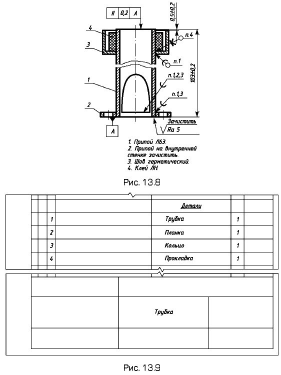На сборочном чертеже трубки (рис. 13.8) в отличие от чертежа общего вида нет изображений формы сечения трубки в различных участках, формы планки, указаны размеры с допускаемыми отклонениями 103±0,2 и 0,5±0,2, допускаемые отклонения параллельности 0,2 торца трубки к плоскости А планки и технические требования. <<< К началу параграфа Следующий параграф >>>