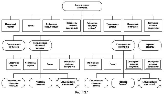 Пример полного комплекта конструкторских документов комплекса приведен на рис. 13.1. Основной конструкторский документ изделия показан в овале. Документы основного комплекта показаны в прямоугольниках (в примере на рис. 13.1 показана часть таких документов). Документы, обведенные в двойные рамки, предусматриваются только для изделий, предназначенных для самостоятельной поставки. Число ступеней входимости для комплексов, сборочных единиц и комплектов, а также число входящих комплексов, сборочных единиц, комплектов и деталей не ограничивается.