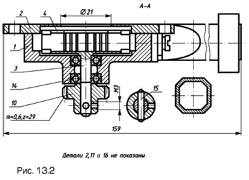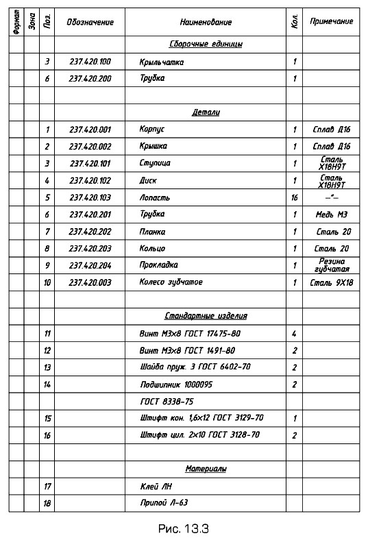 Рассмотрим выполнение сборочных чертежей и основного комплекта конструкторской документации на примере специального вентилятора. Чертеж общего вида вентилятора (проектная документация технического проекта) приведен на рис. 13.2, таблица составных частей для удобства чтения оформлена отдельно на рис. 13.3. Воздух в корпус 1 вентилятора поступает через отверстие диаметром 21 мм в крышке 2 и выдувается через трубку 6 с выходным диаметром 12 мм. Поток воздуха создается крыльчаткой 3, вращающейся в двух радиально-упорных шарикоподшипниках 14, закрепленных в корпусе 1. От внешнего привода крыльчатка вращается через зубчатое колесо 10, закрепленное на оси ступицы 3 крыльчатки штифтом 15. При установке вентилятора его крепят через два отверстия диаметром 4,8 мм в выступах крышки 2 и через два отверстия ∅ 1,8 мм — под штифты. Прокладка 9 из губчатой резины обеспечивает герметизацию соединения трубки с воздуховодом.