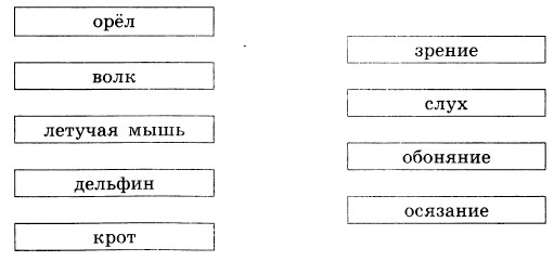 5. Животные также получают информацию с помощью своих органов чувств, но значимость того или иного органа чувств для разных животных различна. Какое, по вашему мнению, чувство является самым главным и наиболее развитым у орла; волка; летучей мыши; дельфина; крота? (Соедините стрелками.)