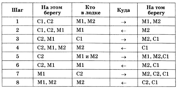 § 1.14. Получение новой информации Разработка плана действий и его записьВо многих информационных задачах требуется установить правило преобразования входных данных в выходные, разработать план действий, обеспечивающий нужный результат. Рассмотрим примеры. Задача 1. Петя и Коля играют в следующую игру: Петя задумывает правило преобразования текстовой информации. Коля может сообщать Пете любые тексты и узнавать результаты преобразования. Вопросы Коли и ответы Пети в этой игре: а → б; мама → нбнб; весна → гётоб. Отгадайте, какое правило задумал Петя. Решение Анализ первой пары «а → б» позволяет предположить, что Петя каждую букву в исходном тексте заменяет на следующую по алфавиту. Проверим наше предположение на второй и третьей парах. Теперь можно сформулировать правило преобразования информации: каждая буква в исходном тексте заменяется на следующую по алфавиту. В результате решения этой задачи мы установили правило преобразования входной информации в выходную. Задача 2. Два солдата подошли к реке, по которой на лодке катаются двое мальчиков. Как солдатам переправиться на другой берег, если лодка вмещает только одного солдата либо двух мальчиков, а солдата и мальчика уже не вмещает?