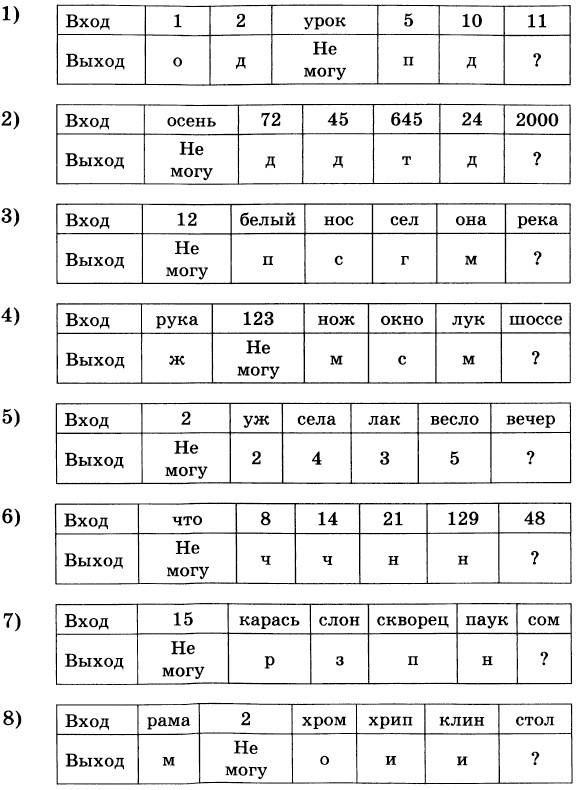 При решении математических или логических задач осуществляется обработка информации, ведущая к получению новой информации. Во многих информационных задачах требуется разгадать правило преобразования входных данных в выходные, разработать план действий, обеспечивающий нужный результат. План действий может быть записан по пунктам, представлен в виде таблицы или схемы.