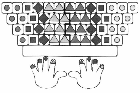 Большие пальцы обеих рук полусогнуты над клавишей ПРОБЕЛ. Клавиатура условно делится на две части — для правой и левой рук. Каждый палец «закреплён» за определёнными клавишами. На рисунке разными геометрическими фигурами обозначены зоны «ответственности» для каждого пальца.