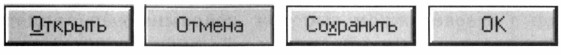 Командные кнопки. Все диалоговые окна содержат кнопки. Часто на кнопках написаны команды, например Сохранить или Открыть. Чтобы воспользоваться командной кнопкой, на ней необходимо щёлкнуть. Наиболее часто встречаются командные кнопки ОК и Отмена. Закончив настройку элементов управления диалогового окна, можно щелчком на кнопке ОК дать компьютеру команду ввести в действие сделанные изменения. Для закрытия диалогового окна без внесения выполненных изменений служит командная кнопка Отмена.