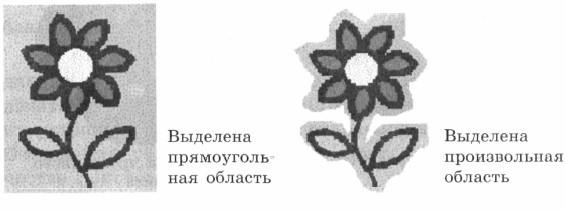 Для выделения прямоугольной области указатель перетаскивают по диагонали через область, подлежащую выделению. Для выделения области произвольной формы указатель протаскивают вокруг нужной части рисунка.