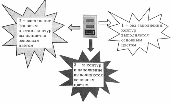 Прямоугольник, эллипс и скругленный прямоугольник строят так: 1) активизируют нужный инструмент; 2) помещают указатель мыши в ту часть экрана, где должна быть построена фигура; 3) нажимают левую кнопку мыши и перетаскивают указатель мыши по диагонали. Чтобы нарисовать квадрат и окружность, при использовании инструментов Прямоугольник и Эллипс следует удерживать нажатой клавишу Shift. С помощью инструмента Многоугольник можно изображать замкнутые ломаные линии причудливой формы. Делают это так: 1) активизируют инструмент Многоугольник; 2) изображают одно звено ломаной (устанавливают указатель в определённом месте рабочей области и перетаскивают его в нужном направлении), отпускают кнопку мыши; 3) поочередно выполняют щелчки в других вершинах ломаной — каждая следующая вершина соединяется отрезком с предыдущей; 4) в последней вершине выполняют двойной щелчок — последняя вершина соединяется с первой. Чтобы многоугольник содержал углы по 45° и 90°, при перемещении указателя следует удерживать нажатой клавишу Shift . Когда активизирован любой из инструментов Прямоугольник, Эллипс, Скругленный прямоугольник или Многоугольник, ниже панели инструментов появляются три возможных способа заполнения. Здесь показан эффект от применения каждого из них: