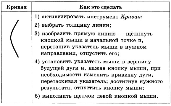 Инструмент выбирается левым щелчком на его кнопке. Перемещением курсора мыши его устанавливают в нужную точку рабочей области. Применяют инструмент протягиванием мыши при нажатой кнопке (левой или правой). Для закраски замкнутой области используют инструмент Заливка Если при работе с инструментами Карандаш, Кисть, Распылитель и Заливка вы нажимаете левую кнопку мыши, то изображение выполняется основным цветом. Если нажимаете правую кнопку — фоновым. Инструменты чертёжникаРисовать Карандашом и Кистью начинающему художнику трудно. В графическом редакторе есть несколько удобных инструментов для рисования простейших графических объектов: прямых и кривых линий, квадратов, прямоугольников, многоугольников, эллипсов и кругов. С помощью инструмента Линия С помощью инструмента Кривая