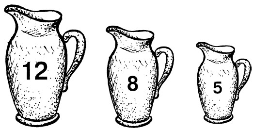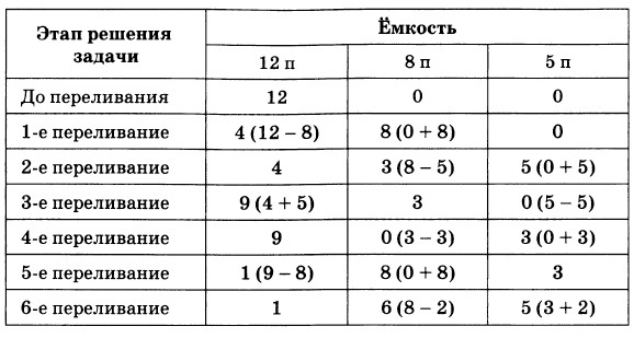 Глава 3. Материал для любознательных Запись плана действий в табличной формеЕсть много задач, решение которых удобно представлять в табличной форме. Рассмотрим одну из них. Задача. Некто имеет 12 пинт* мёда и хочет отлить из этого количества половину, но у него нет сосуда вместимостью в 6 пинт. Он имеет два сосуда: один вместимостью в 8 пинт, а другой вместимостью в 5 пинт. Каким образом налить 6 пинт мёда в сосуд на 8 пинт? Какое наименьшее число переливаний необходимо при этом сделать? * Пинта — единица объёма и ёмкости (вместимости) в США, Великобритании и ряде других стран; равна примерно половине литра.