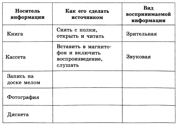 7. Определите источник и приёмник информации, а также характер (односторонний, двусторонний) передачи информации в следующих ситуациях: 1) школьник читает текст в учебнике; 2) бабушка читает письмо; 4) разговаривают подруги: Таня и Лена; 5) учитель объясняет новый материал всему классу; 6) регулировщик управляет потоками машин и пешеходов; 7) человек читает объявление в газете; 8) завуч вывешивает листочек с изменениями в расписании уроков; 9) диспетчер сообщает, что автобусный рейс отменяется; 10) вывешен знак, запрещающий проезд по улице; 11) мальчик получил пригласительный билет на ёлку. 8. Заполните таблицу: