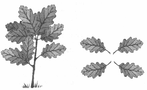 Глава 4. Компьютерный практикум Работа 13. Работаем с графическими фрагментамиЗадание 1 1. Запустите программу Paint. 2. Откройте файл Природа (Мои документы\5класс\Заготовки). Рассмотрите появившийся на экране рисунок. Подумайте, какое дерево на этом рисунке можно назвать «лишним»? Почему? 3. С помощью инструмента Выделение заключите «лишнее» дерево в прямоугольную рамку. Тем самым вы выделите фрагмент. Удалите выделенный фрагмент (клавиша Delete). 4. Поочерёдно выделяя и перетаскивая оставшиеся деревья, расположите их в один ряд. При необходимости используйте инструмент Выделение произвольной области. Ошибочные действия отменяйте командой Отменить меню Правка. 5. С помощью инструмента Надпись подпишите название каждого дерева. 6. Сохраните рисунок в личной папке под именем Природа1. Задание 2 1. Откройте файл Природа (Мои документы\5класс\Заготовки). 2. Выделите фрагмент, содержащий дуб. Копируйте выделенный фрагмент (команда Копировать меню Правка). 3. Выполните команду Создать меню Файл. 4. Выполните команду Вставить меню Правка — точная копия выделенного фрагмента появится на экране. Перетащите фрагмент в центр экрана. 5. Выделите новый фрагмент, содержащий дубовый листок. 6. Перетащите выделенный фрагмент, удерживая нажатой клавишу Ctrl; когда кнопка мыши будет отпущена, на экране появится копия фрагмента. 7. Размножьте выделенный фрагмент и преобразуйте (команда Отразить/повернуть меню Рисунок) так, чтобы получился следующий рисунок.