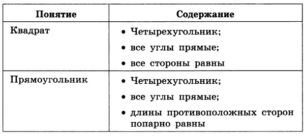Как видно из таблицы, содержания понятий отличаются одним признаком: у квадрата длины всех сторон равны, а у прямоугольника длины противоположных сторон попарно равны.