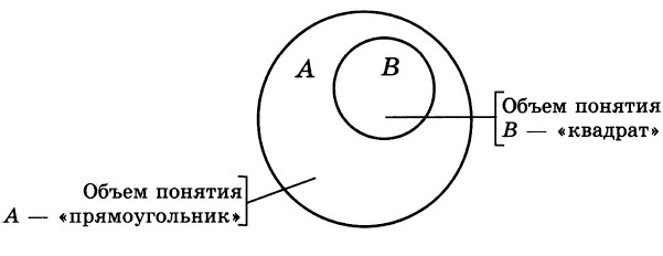 Объем понятия «прямоугольник» больше объема понятия «квадрат», так как все квадраты — тоже прямоугольники. Отношения между понятиями удобно представлять кругами.